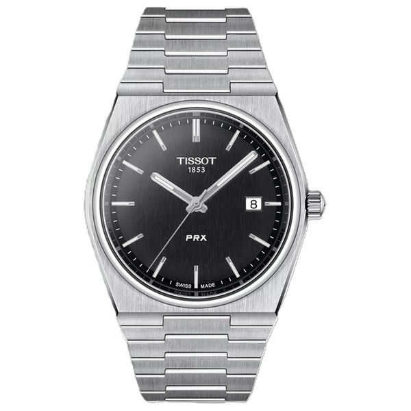 Tissot watch with precise Swiss quartz movement, scratch-resistant sapphire crystal, black dial with clear hands and markers, and date window.