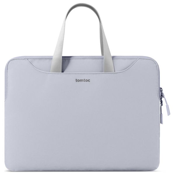 Tomtoc 13.5-inch slim laptop bag with padded laptop compartment, additional side pockets, soft velvet inner lining, water-resistant fabric with high-quality YKK zippers, and foldable top handles for easy carrying.
