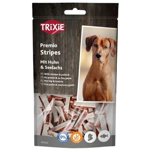 Trixie Chicken & Pollock dog treats combine chicken meat (65%) and pollock (18%), with soybean protein, potato starch, glycerine, and minerals. This gluten-free formula contains no added sugar and provides a protein-rich snack for dogs.