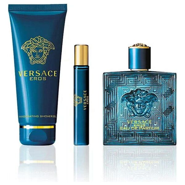 Versace Eros Perfume Set for men includes Eros Eau de Parfum 100 ml, a travel size 10 ml EDP, and a 150 ml Shower Gel. The fragrance blends woody, oriental and fresh notes for a bold masculine profile. Top notes: Italian Lemon, Italian Mandarin, Mint, Candied Apple; Middle notes: Geranium, Sage, Amber; Base notes: Atlas Cedarwood, Virginia Cedarwood, Vetiver, Patchouli, Sandalwood, Vanilla.