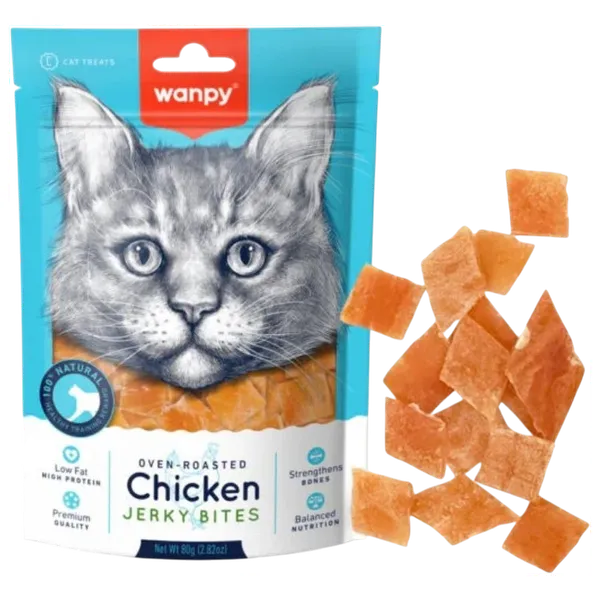 Oven-fried dried chicken fillets are a cat snack designed for kittens and cats over 3 months old. Made with 100% natural ingredients, no artificial flavors or colors, and low in salt, it provides high-quality animal protein with approximately 1.5% fat, supporting bone health with calcium and phosphorus, and is easy to digest. Ingredients: Chicken, Glycerin, Vegetable Protein, Sorbitol, Seafood Extract
