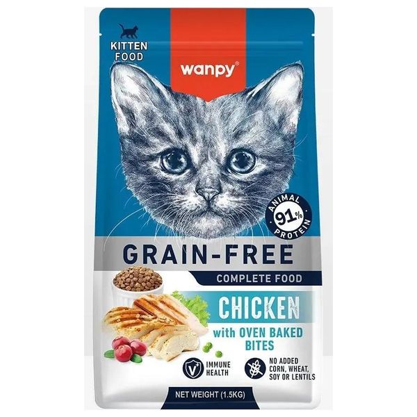 Grain-free, designed to support healthy kitten growth, proper digestion, and muscle building, contains dried chicken (53.53%), sweet potato, tapioca starch, natural oils, and ingredients such as cranberry, yucca, and psyllium to promote overall health