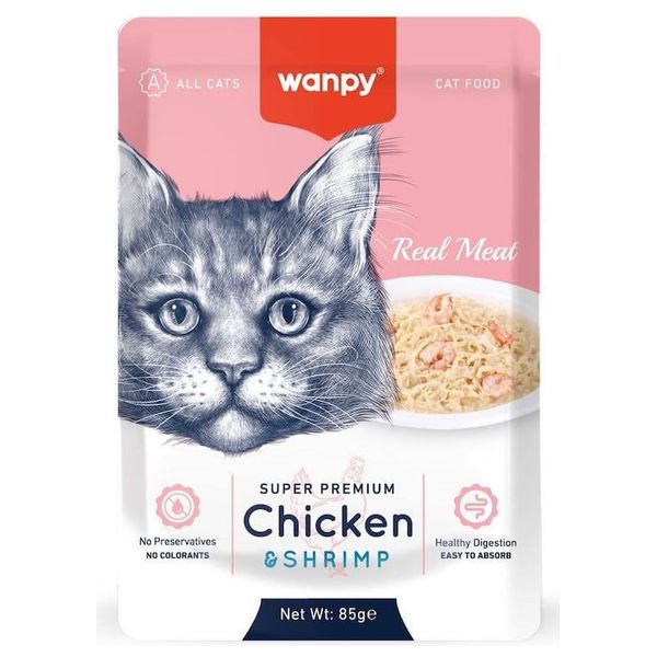 Wet cat food blending tender chicken with shrimp, delivering real meat flavor with a satisfying texture, providing balanced nutrition for cats, formulated without preservatives and colors