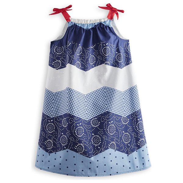 Navy blue&white patterned girl's summer dress. Made of 100% woven poplin fabric. Half lining is used in the upper body. Straps are made of satin fabric. Bows are fixed to the straps for child safety. All Denokids products are produced in accordance with Child Safety Rules. In order to prevent any harm to your child's skin, all products are passed through metal detectors that can detect broken needles., Material 100% Cotton, Washing ins. Machine wash at 30°C. Wash inside out. Do not bleach. Do not tumble dry. Iron backside on low heat.