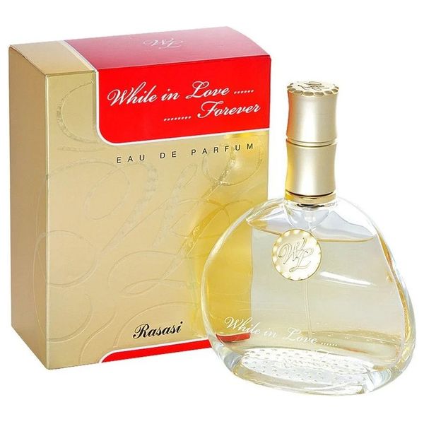 While in Love Forever by Rasasi is a women's eau de parfum with a fruity-floral profile. Top notes are Grease, Green Apple, Sicilian Lemon; heart notes Jasmine, Bamboo, White Rose; base notes Musk, Amber, Cedarwood. The 80 ml bottle is finished in a gold tone, offering a balanced fragrance suitable for everyday wear and special occasions.