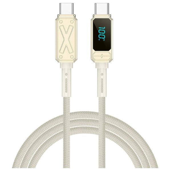 WiWU's 100W USB-C to USB-C fast charge cable provides up to 100W USB Power Delivery for laptops, smartphones, and tablets. Its braided construction offers durability against bending and pulling, and a digital display shows real-time charging power. With a length of 1.6 meters and gold-colored connectors, this cable blends style with reliable performance for everyday USB-C charging.