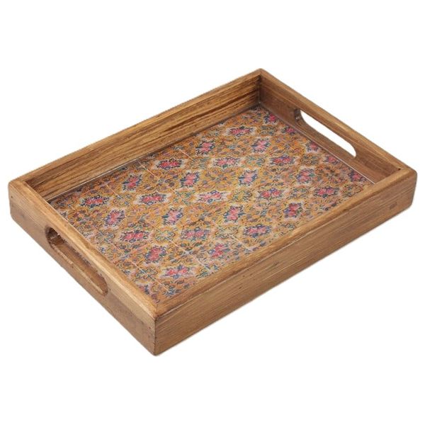 A handcrafted wooden serving tray with ornate carvings in a rich finish. Measuring 25x37 cm, it offers a stylish and practical surface for serving appetizers, desserts, or main dishes, making it suitable for hosting guests or everyday family meals