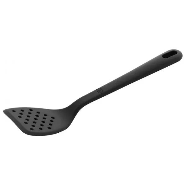 ballarini nero spatula made of food-safe silicone, heat-resistant up to 230°C, ergonomic non-slip handle, protects pan coating, holes drain fat, dishwasher-safe, modern Italian design by Matteo Thun & Antonio Rodriguez, with practical hanging loop.